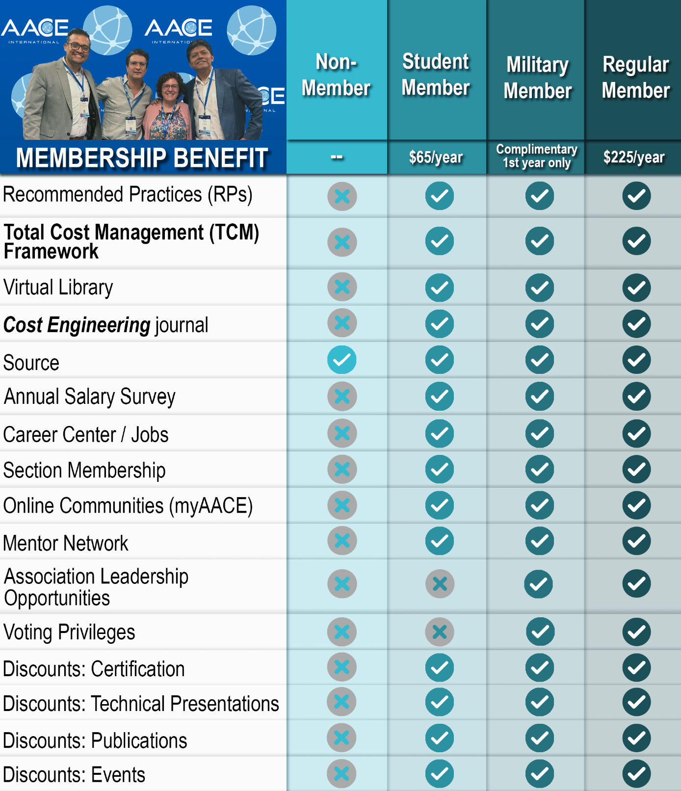 An AACE membership provides access to recommended practices, the Total Cost Management (TCM) Framework, technical journals, virtual libraries, career resources, networking opportunities, leadership roles, voting privileges, and exclusive discounts on certifications and events.